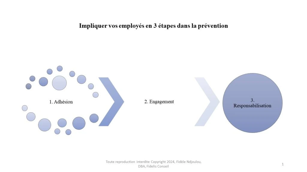 La deuxième étape est l’engagement. Après avoir obtenu l’adhésion, l’engagement des employés dans le processus de prévention devient plus facile et plus efficace. C’est à cette étape que les employés vont se mettre à participer activement aux efforts de prévention afin d’assurer sa pérennité.